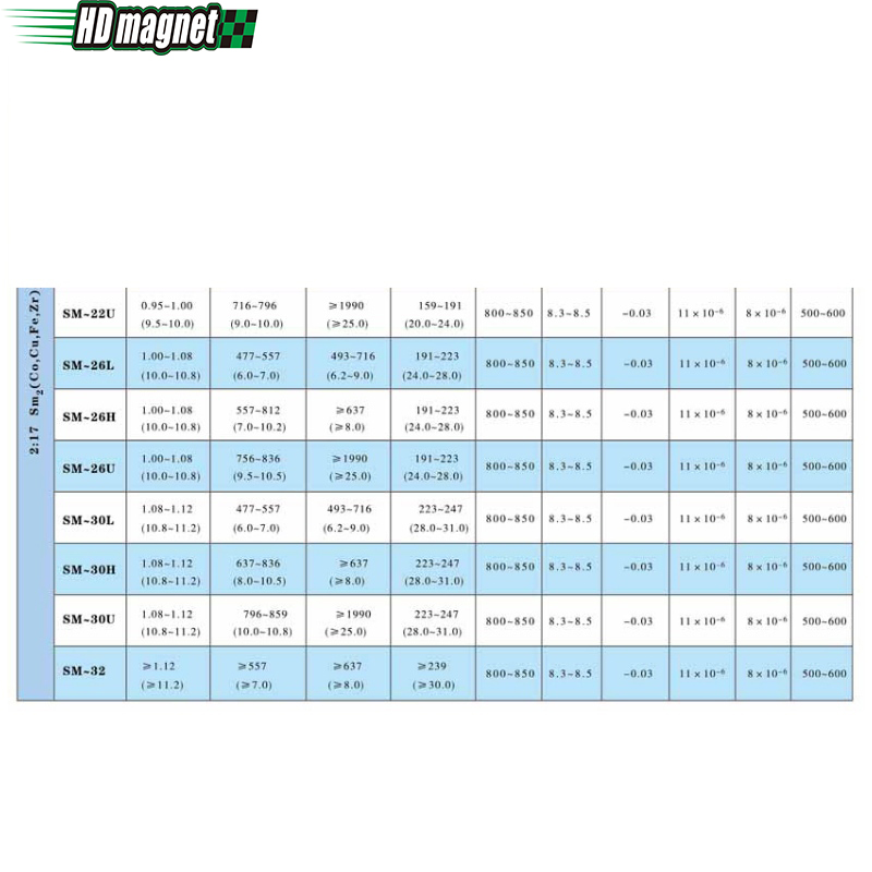 Magnety kobaltu Samaria (SmCo) mají v současnosti především dvě složky: SmCo5 a Sm2C17.Magnety na kobalt Samarium mají silnou odolnost proti korozi a oxidaci, takže jsou široce používány v leteckém, obranném a vojenském průmyslu, mikrovlnných zařízeních, komunikaci, lékařské vybavení, nástroje, měřiče, různé magnetické přenosové zařízení, senzory, magnetické procesory, motory, magnetické jeřáby a další pole.